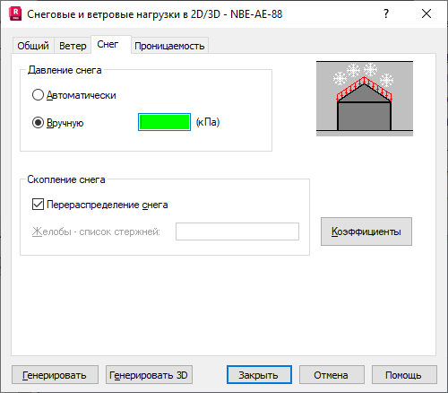 - Автоматически – опция запускает автоматический расчет давления снега на основании заданных параметров положения конструкции;