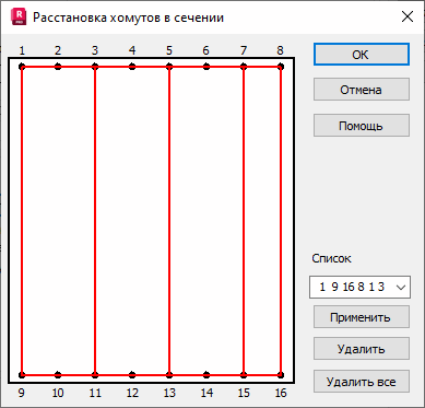 Определение формы и распределения поперечного армирования осуществляется щелчком кнопки мыши по последовательным продольным стержням. Определенные формы представляют собой замкнутые формы хомутов. Символом штифта или хомута является прямой сегмент, соединяющий два продольных стержня. Последовательное определения формы можно закончить, нажав на кнопку Применить.