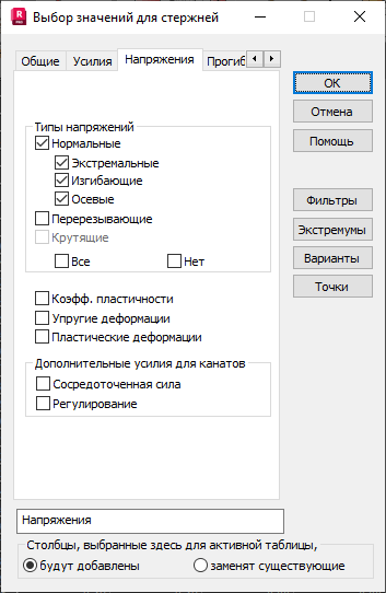 Если в диалоговом окне Выбор значений для стержней выбрана вкладка "Напряжения", то на экране появится следующее диалоговое окно.