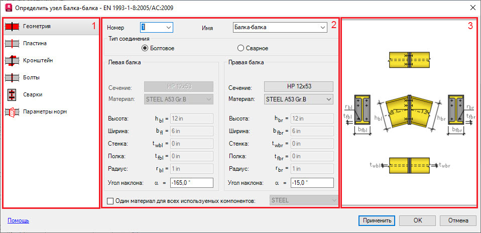 Количество закладок в этом диалоговом окне зависит от выбранного типа соединения: болтовое или сварное.