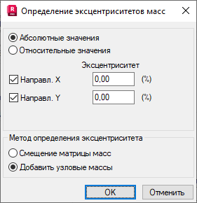 Показанное ниже диалоговое окно используется для учета в сейсмических расчетах перемещения массы при наличии эксцентриситета. Диалоговое окно доступно при нажатии на кнопку Определение эксцентриситетов в диалоговом окне Параметры модального расчета.