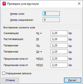 Опция предназначена для установки параметров при ручной проверке выбранного шарнирного соединения.