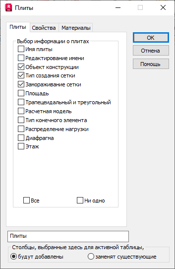 - Выберите Плиты и оболочки и нажмите кнопку ОК, чтобы открыть таблицу "Плиты".