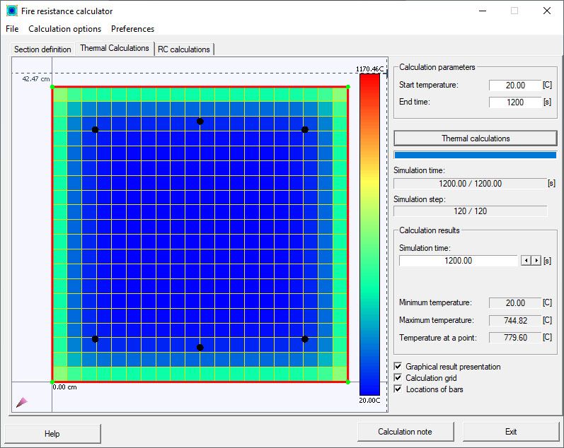 Нажмите кнопку Расчеты чтобы начать температурные расчеты для сечения. Процесс расчета представлен графически в поперечном сечении ж/б элемента (должен быть выбран параметр Графическое представление результата). Ход выполнения процесса отображается с помощью индикатора хода выполнения и изменения значения времени и шага моделирования (см. Параметры температурных расчетов).