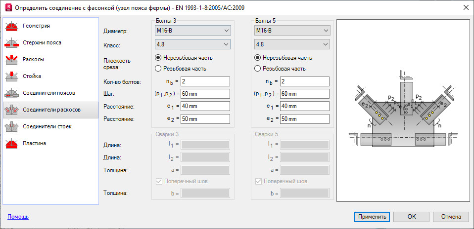 - диаметр и класс болтов, используемых для подсоединения стержня с фасонкой, расположение болтов на стержне и плоскость среза (при выборе болтового соединения);