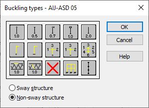 Коэффициент расчетной длины вводится автоматически при выборе одного из значков с соответствующими условиями крайней опоры. Значки разделены на две группы: первая содержит типовые (код) методы опоры элемента и соответствующего значения коэффициента продольного изгиба, а другая - содержит значки для расчета коэффициента продольного изгиба колон, многоэтажных конструкций (расчет коэффициента длины продольного изгиба для одного, трех и шести смежных стержней). При двойном щелчке по иконкам изображающим расчет коэффициента длины продольного изгиба (
