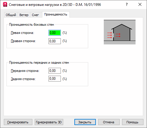 При переходе в диалоговом окне Снеговые/ветровые нагрузки на вкладку Проницаемость открывается следующее диалоговое окно.
