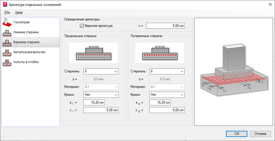 Чтобы создать верхнюю арматуру, в поле Определение арматуры включают опцию Верхняя арматура. Здесь задают такие характеристики верхней арматуры: