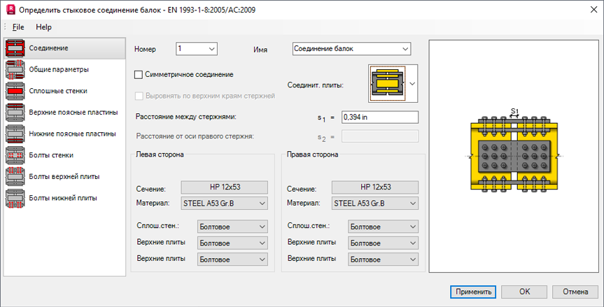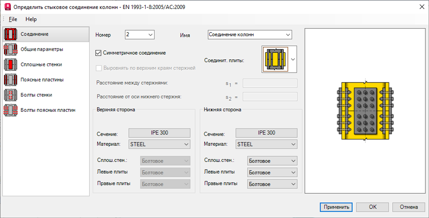 Прим.: Если выбран параметр "Симметричное соединение", список пластин в меню Соединительные плиты содержит только симметричные варианты.