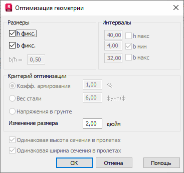 В случае многопролетной балки может быть наложено дополнительное ограничение оптимизации: требование одинаковых поперечных размеров в отдельных пролетах. Можно ограничить изменения одного или обоих размеров.