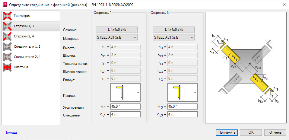 На вкладке "Стержни 1, 3" задаются основные параметры стержней, примыкающих к фасонке и расположенных на линиях 1 и 3. Определите следующие параметры: