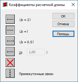 Для корректного вычисления коэффициента продольного изгиба необходимо определить расчетную длину при продольном изгибе. В диалоговом окне содержатся типичные способы опоры элементов, которые определяют соответствующие значения коэффициента расчетной длины устойчивости при изгибе.
