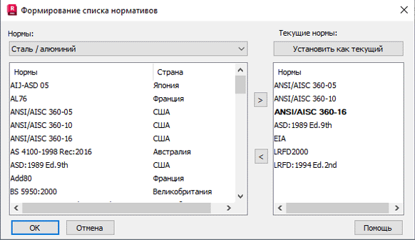 Это диалоговое окно используется для создания списка доступных кодировок для норм проектирования и нагрузок.