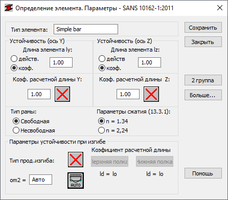 Имя выбранного типа элемента отображается в поле Тип элемента (в это поле можно ввести любое имя типа элемента). В полях "Устойчивость Y" и "Устойчивость Z" можно ввести длину элемента в соответствующей плоскости. Определить длину можно двумя способами: