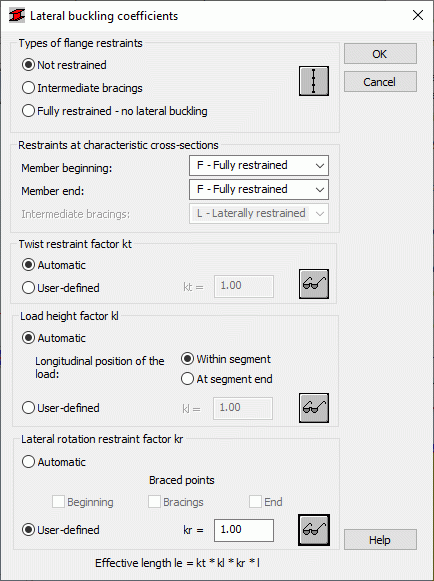При расчете Robot автоматически вычисляет коэффициент kt на основании заданных типов ограничений у концов элемента, а также информации о высоте нагрузки (в центре сдвига или на верхней полке) и о расположении продольной нагрузки. Этот коэффициент также можно задать вручную, выбрав параметр «Произвольный».Чтобы открыть окно с таблицей 5.6.3.(2) норм, щелкните значок рядом с этим параметром.