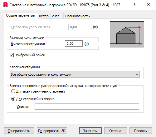 При переходе в диалоговом окне Снеговые/ветровые нагрузки на вкладку Общие параметры отображается следующее диалоговое окно: