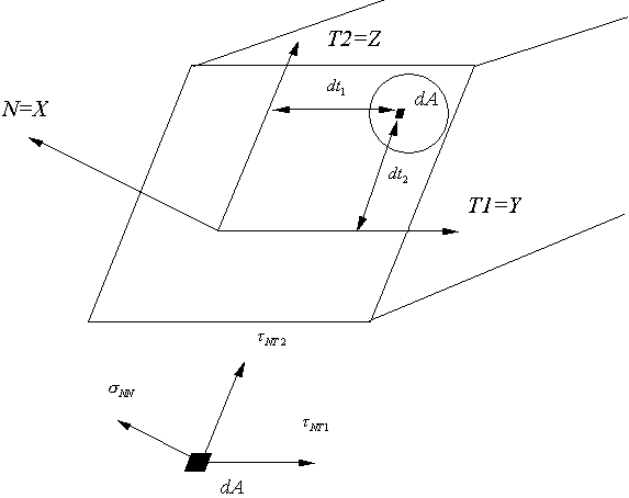 С перечисленными направлениями связаны следующие напряжения: σNN, τNT1 и τNT2.