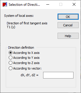 При определении направления для разрезов твердых тел (если включен параметр "Внутренние усилия в таблице" на вкладке "Подробно"), параметр "Выбор направления" определяет направление первой касательной оси T1 в соответствии с выбранным вектором или направлением главной системы координат.