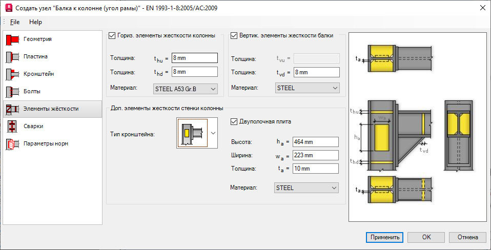 Для создания вертикальных ребер жесткости для балки и горизонтальных для колонны используют закладку Элементы жесткости.