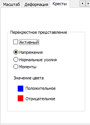 Результаты по плоским конечным элементам могут быть представлены в форме изолиний (карт) или в форме крестов. Выбранный параметр будет представлен крестами, если на вышеупомянутой вкладке выбрана опция "Активный". Крестами можно представить три типа величин: напряжения, силы и моменты. Крест представляет собой максимальное и минимальное значения, повернутые в основной системе координат.