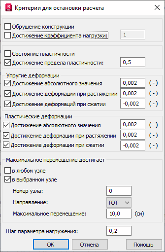 Расчет выполняется до тех пор, пока величина максимального перемещения выбранного узла не достигнет предельной допускаемой величины перемещения, заданного пользователем (>0), или пока не будет достигнуто расхождение итеративного процесса. Расчет останавливается, если осуществляется одно из этих условий.