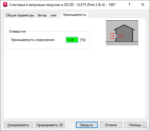 При переходе в диалоговом окне Снеговые/ветровые нагрузки на вкладку Проницаемость открывается следующее диалоговое окно.