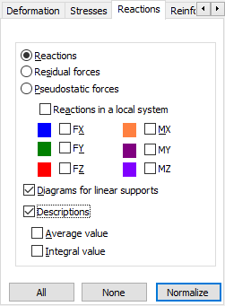 - реакции: реактивные силы – значения реактивных сил в опорах и реактивных моментов - значения моментов в опорах;