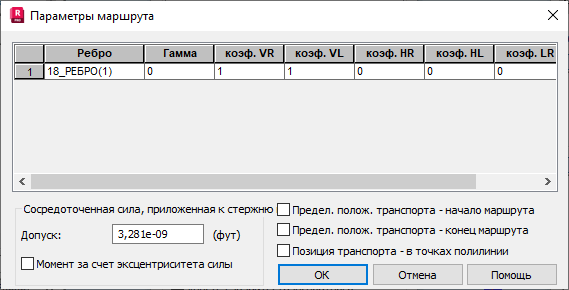 Нижняя часть диалогового окна содержит поле Толерантность.. Это параметр, присваиваемый определенному варианту расчета на подвижную нагрузку. Толерантность определяет условия создания нагрузок, возникающих от перемещающегося по стержням транспортного средства. Если включена опция Момент от сил, приложенных с эксцентриситетом, то формируется нагрузка на стержень в виде сосредоточенного момента, который возникает от действия сосредоточенной силы, приложенной к стержню с эксцентриситетом.