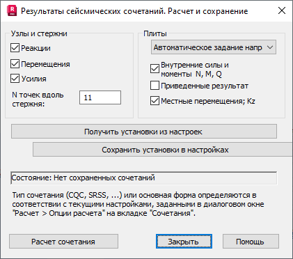 Поля Узлы / Стержни и Плиты используются для выбора типа результатов, которые должны рассчитываться для сочетаний сейсмического расчета.