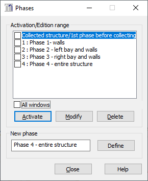 - определить этап конструкции в диалоговом окне, приведенном ниже; этап будет введен в поле Активизация/диапазон редактирования;