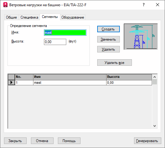 После открытия диалогового окна Ветровые нагрузки на башни и перехода на вкладку Сегменты на экране появляется следующее диалоговое окно.