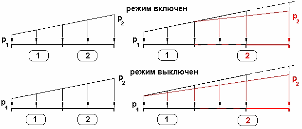 На следующем изображении схематически показан принцип действия параметра Назначить нагрузки отдельным стержням цепи при изменении геометрии конструкции для трапецеидальной нагрузки (2p). На верхнем изображении показано, что произойдет при установке флажка, а на нижнем — при его удалении.