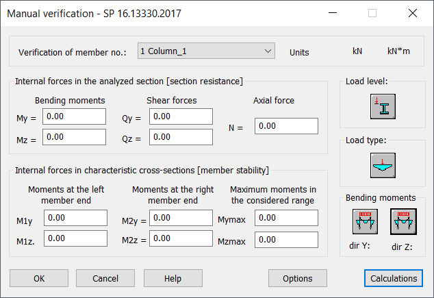 Это диалоговое окно используется для проверки стальных элементов на предмет воздействия на них внутренних усилий, в соответствии с требованиями Российских норм стальных конструкций СП16.13330.2011.