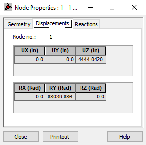 Кроме номера узла эта вкладка представляет значения перемещений, вычисленные для выбранного узла и варианта случая нагрузки. Перемещения представлены в табличной форме. Если активный выбор содержит более одного случая нагрузки, будут показаны максимальные значения перемещений.
