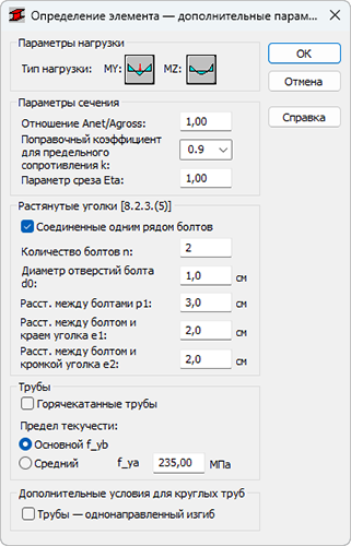 Этот параметр используется для задания дополнительных параметров норм для определенного типа стальных элементов. Она активируется нажатием кнопки «Больше...» в диалоговом окне «Определение элемента. Параметры».
