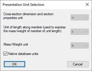 Изменения, внесенные в единицы измерения, используемые в базе данных сечения могут быть сделаны после отключения исходных единиц базы данных. Только затем будет доступен список соответствующих значений.