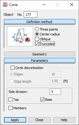 Прим.: Если выбрана опция Центр - Радиус для определения окружности в качестве основания конуса или/и типа правильного усеченного конуса, конус определяется в два этапа: