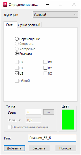 В поле Точка выбирается узел/стержень/элемент. Можно ввести номер в соответствующее поле редактирования.