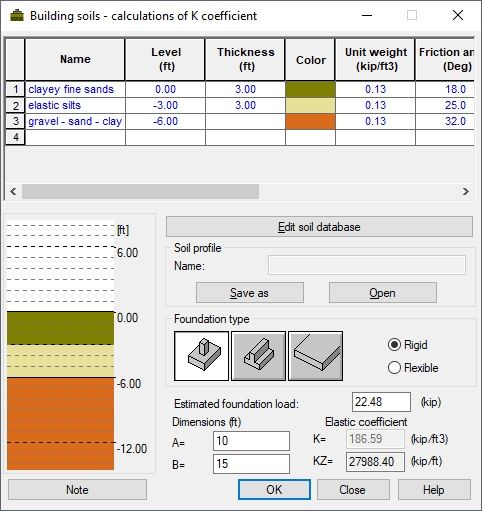 В калькуляторе, коэффициент K рассчитывается на основании среднего значения нагрузки на фундамент на единицу площади. Эквивалентные KZ коэффициент для фундамента с заданными размерами также рассчитаны.