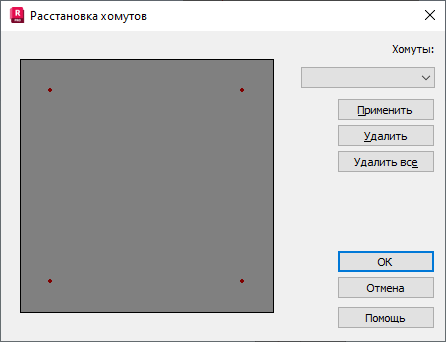 Если пользователь допустил ошибку в процессе задания хомута (неправильно задана его форма), то этот хомут может быть удален. Для этого следует выбрать его имя в списке редактирования и нажать кнопку Удалить. Нажатие кнопки Удалить все приведет к удалению всех расставленных хомутов.