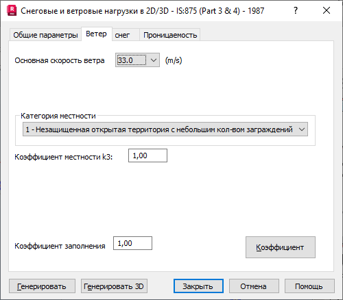 Нажмите кнопку Коэффициент, чтобы открыть диалоговое окно для определения коэффициентов ветровой нагрузки.