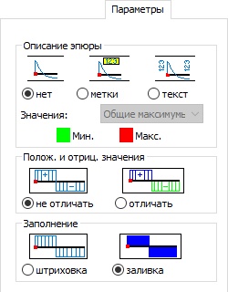 - нет – при выборе этой опции описания величин, доступных в диалоговом окне Эпюры, на графиках этих величин будут отсутствовать;