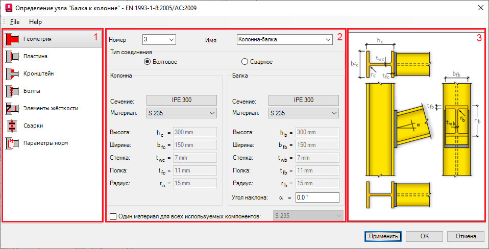 - Слева находятся опции для выбора компонента, используемого для определения стального узла:
