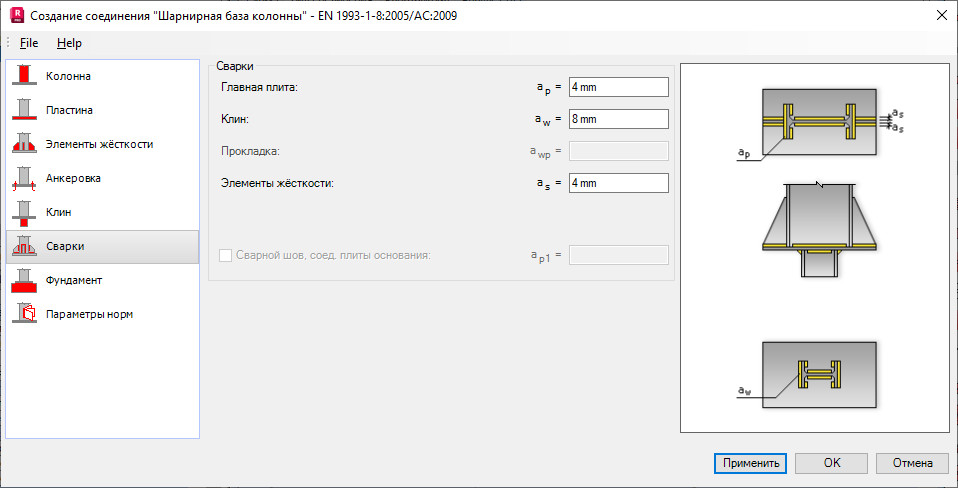 Закладку Сварка используют для того, чтобы определять сварные швы, соединяющие отдельные элементы основания колонны (такие, как основную плиту, клин, прокладку, элементы жесткости).