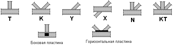 Расчет узлов затрагивает следующие типы трубных соединений: K, N, KT, T, Y и X. Можно также использовать двутавры как пояс в соединении, а также использовать кронштейны (горизонтальные, боковые пластины), приваренные к поясу фермы (см. рисунок ниже).