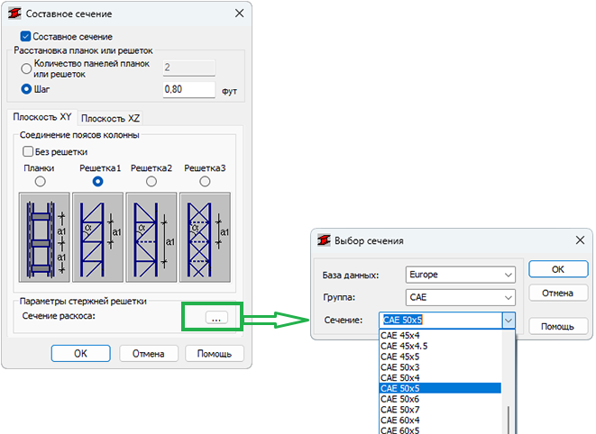 При нажатии кнопки […] справа от параметра «Сечение диагонали» открывается диалоговое окно «Выбор сечения», в котором можно определить имя элемента решетки. Выбор сечения приводит к тому, что его площадь A/An автоматически вводится в поле редактирования в диалоговом окне Соединение поясов.