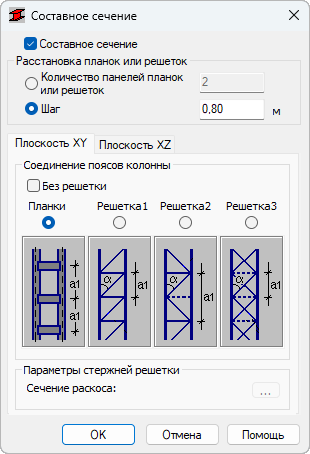 Предполагается, что соответствующие плоскости планок (решеток) параллельны локальным осям составного сечения (где x — продольная ось элемента, y — горизонтальная ось, z — вертикальная ось). На вкладке «Плоскость XY» можно определить типы планок или решеток, расположенных в плоскости, параллельной локальной оси Y. Аналогично, на вкладке «Плоскость XZ» можно определить параметры планок или решеток, расположенных в плоскости, параллельной локальной оси Z. Если выбран вариант «Без решетки», то при расчетах не учитывается тот факт, что это составной стержень, и расчеты выполняются исходя из предположения, что хорды являются полностью интегрированным целым в данной плоскости.