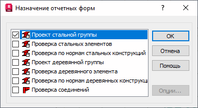 Список допустимых отчетных форм расположен в левой части диалогового окна.