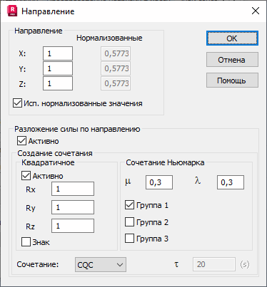 Опция "Разложение сил" по направлениям (в сейсмическом / спектральном расчете) позволяет автоматически создавать три сейсмических случая, различающихся направлением воздействия. Направление возбуждения (X; Y; Z), определяемое в верхней части диалогового окна, разделяется на (X; 0; 0) (0; Y; 0), (0; 0; Z) для направлений X, Y и Z, соответственно. Имена вновь создаваемых вариантов содержат информацию, указывающую, в каком направлении определено возбуждение. Следовательно, значения, заданные в полях X, Y, Z, являются компонентами вектора возбуждения. Если включена опция "Использовать нормализованные значения", то значения компонента масштабируются таким образом, чтобы результирующий вектор являлся единичным.