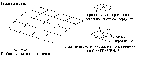 Типичная ситуация показана на рисунке ниже где все элементы расположены на цилиндрической поверхности. Изначально местные оси x параллельны глобальной оси X. Эти оси будут определены заново при использовании главного направления (отсчетного направления), которое параллельно глобальной оси Y.